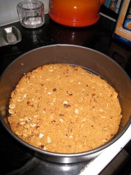For the crust, I used store-bought graham crackers and chopped hazelnuts, mixed with melted butter and baked til set. I would have used some other kind of cookie for the crust, but the food processor broke and the budget does not include a new one just yet.