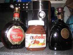 I first thought of great dollops of Nutella sandwiched between layers of cheesecake. I was going to nuke it and make it more spreadable, but lo and behold it says right on the jar “do not microwave” and given its unknown chemical makeup, I thought it wise to heed that advice. I’d also planned on flavoring the cheesecake with Frangelico, but alas, did not have any. I did however have some Godiva liqueur and Amaretto, which I used. Liberally. Hey, the alcohol cooks out.