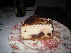 The next day, I melted some good chocolate and guilded the lily a bit. Next time, I’d go with more of ganache topping- I didn’t like the hard chocolate shell. Or maybe a baked sour cream topping with liqueur and brown sugar.