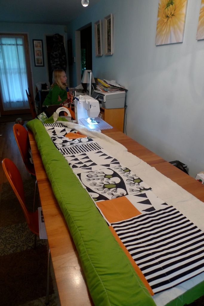 I didn’t do this consciously, but I like how it looks very comic-strip-ish. Bold and graphic, suitable for a Godzilla-loving 13 year old boy.  Once I got the main section (the part that would lay on top of the bed) laid out, I pieced it, and went on to add borders for hanging over.  Then it was off to the fabric store for backing fabric and batting.  I first thought I’d do something black on the back, maybe flannel, but that would gray out the white fabric on the front.  I didn’t feel like making the trek back down to IKEA or I would have gone for the striped fabric for the back too.  Instead I found a green that was close to the green in one of the patterns on the front.  On to the tricky bit.