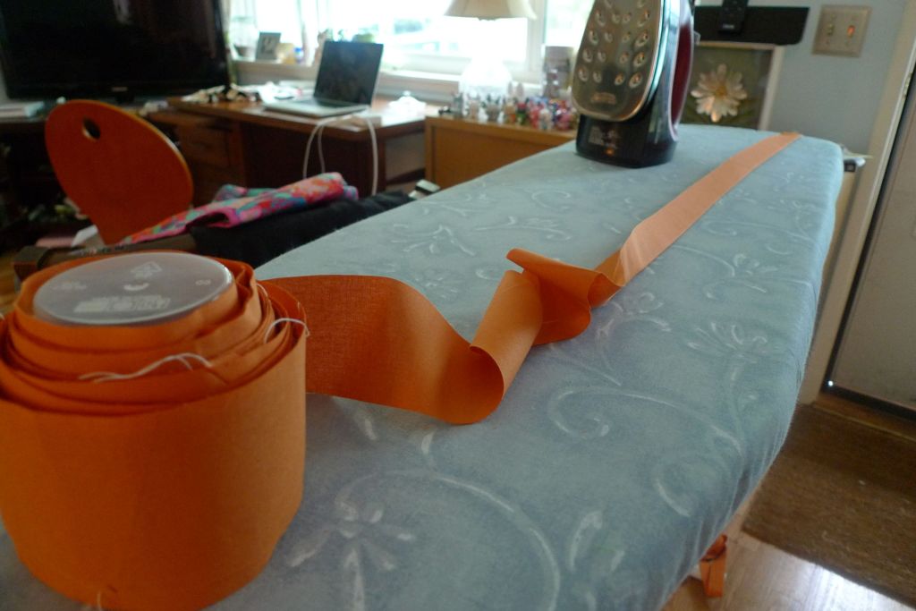 Cut and pieced and ironed the binding strips, and sewed onto the back of the quilt edge.  I wish I had made it a smidge wider because it was a bear folding that over to the front edge for finishing.  I chose green thread for the front edge stitching (going for contrast) but I wish I had stuck with orange.  Live and learn.