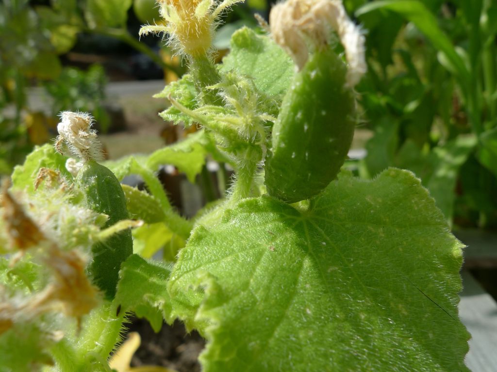 Still a few things in progress; check out the wee tiny cucumbers and a pepper!