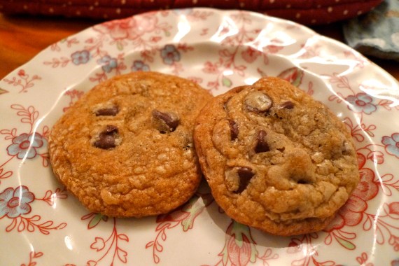 For years my go-to chocolate chip cookie recipe has come from Fine Cooking.  It kicks ass, and I have had no reason to look for another.  Until.  Until I discovered an intriguing recipe from Alton Brown called The Chewy.  My standard recipe varies from the one on the Toll House package because it uses cold butter, not room temp.  This makes for a nice, thick and chewy cookie.  It also makes an unholy mess when you try to cream the sugar into the cold butter.  (You’ll want to cover your mixing bowl if you try it. Just saying.)  But Alton’s uses melted butter!  And BREAD FLOUR!  And a little milk!  And it has a cult-like following.  Clearly, I needed to see what all the fuss was about.  (And if successful, try to make the ultimate oatmeal cookie, long searched for.)