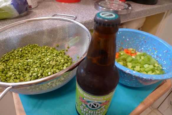 Given the fact that it is apparently the season of never-ending winter up in these parts, some soup seemed like just the thing. This one really could not be easier – not that any soup is hard. Split pea! With beer! And sausage!