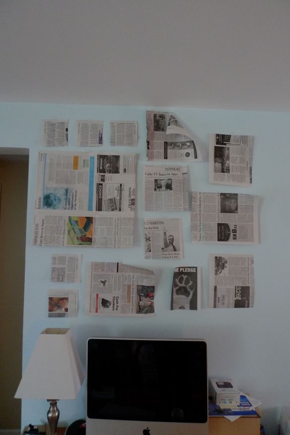 There is a space on the wall above our “office” (and by that I mean the desk upon which our computer sits in the living/dining area) that has never been quite right. Add to that my growing collection of thrifted art with no home, and the light bulb went off. Gallery style hanging! I thought it might help separate the space visually from the rest of the wall. Regular readers will know precision in anything is not my preference/strongpoint, so I was a bit wary about taking this on and having it turn out halfway decent. Then I saw on the glorious interweb about using newspaper templates to figure out the layout – even I could handle that.