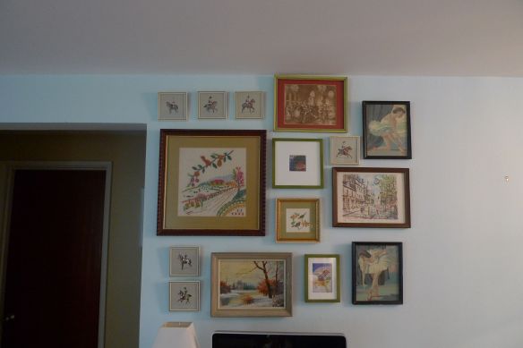 Now, the biggest problem is that most of this art hangs by wires, making it hard to measure where the nail should go. Let’s not tell The Geek how many *ahem* extra nail holes there may be. And yes, I know the spacing is not perfect – you artist types will just have to live with it. Especially the horsy print on the right – it is just a tad too big for that leftover space – but since it is a horse, I think a certain artist might forgive me.