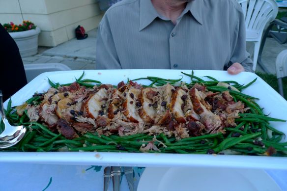 After an hour or so of mingling/getting their cocktail on, guests sat down to a first course of mixed greens with Herbfarm dressing, a very simple starter. It should be said that the food had to be brought downstairs to be served, and given that we could only carry 4 or so plates at a time, it was painful the next day. Mike was busily roasting green beans and slicing porchetta – all prettily arranged on 3 platters, along with three bowls of cranberry beans and three baskets of homemeade focaccia. Everyone oohed and ahhed, and dug in to some very tasty food and wine.
