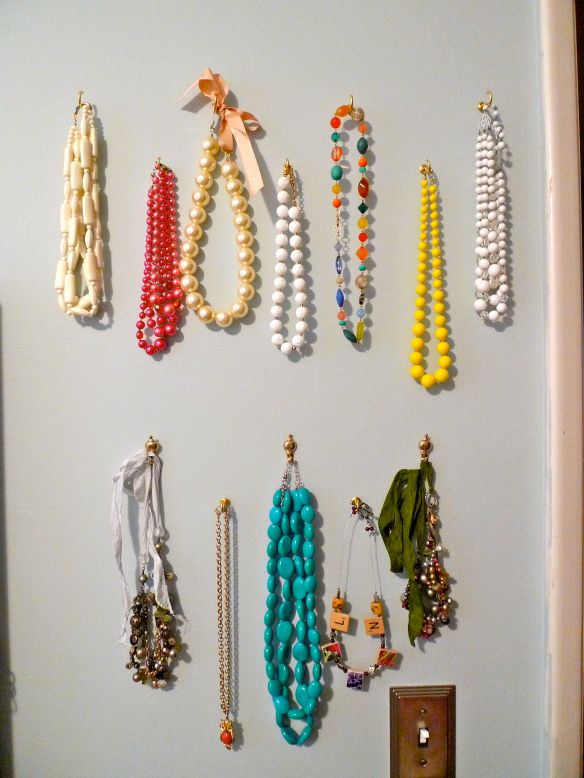 But I digress. I’d been coveting something like this for a while, a way to display jewelry on the wall. Too pricy, for sure, but I like the idea of seeing what I have so that I might actually wear it. My original idea was to get one of those old wooden thread spool holders at Goodwill but of course, when I want to find something, I can’t.  On to Plan B.