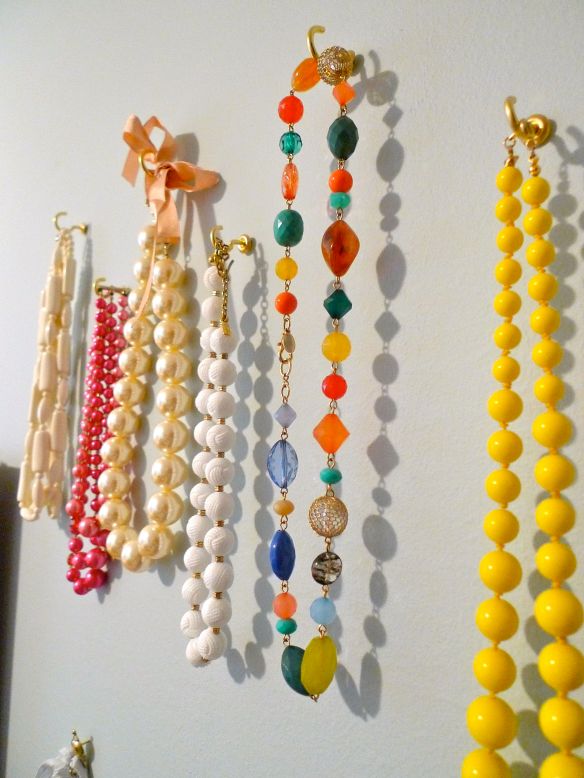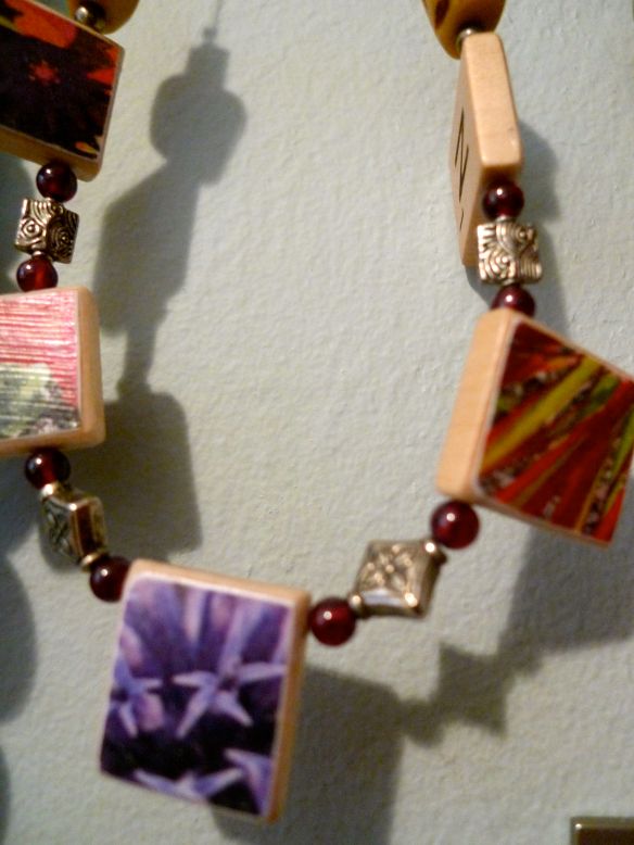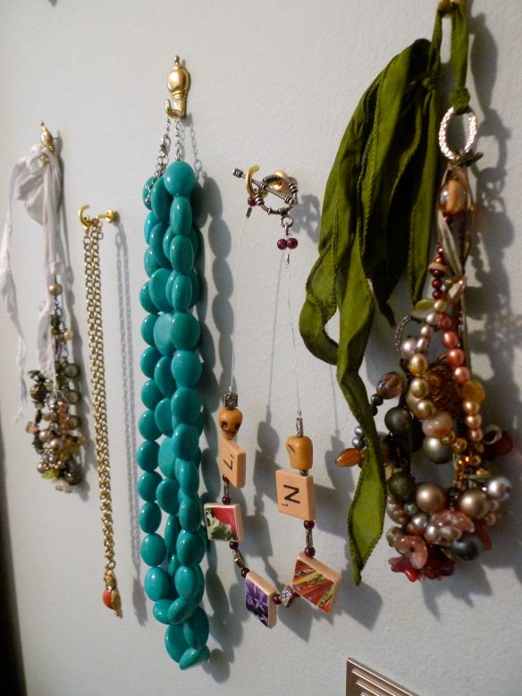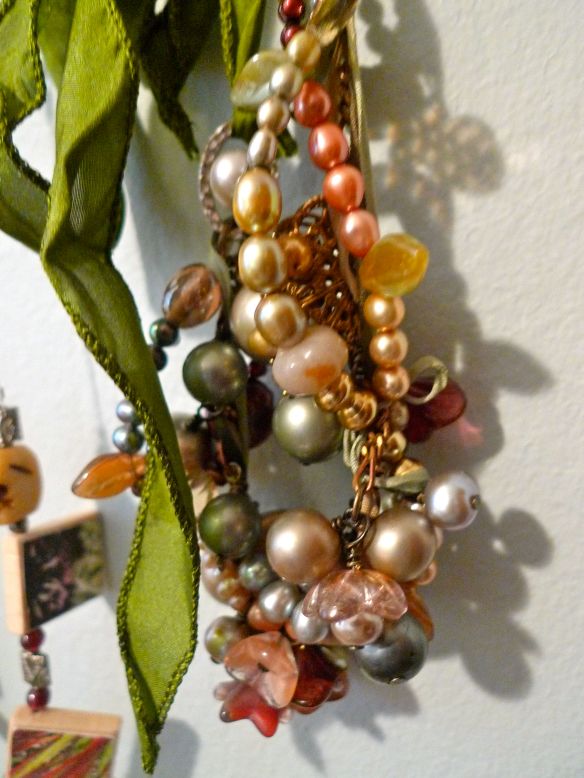 In other brilliance, I’ve got several necklaces made by friends that bear mentioning. There are two in the bottom row with all sorts of lovely beads and rbbons were given to me by Jeanne, who has an Etsy shop where she sells her work.