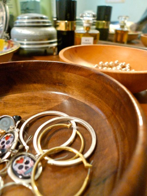 Cup holders! Those little hooks you can just screw into the wall!  I bought several in different sizes, and actually planned to tie a ribbon across two of them for earrings, but then I found two lovely little wooden bowls while searching for the spool holder.