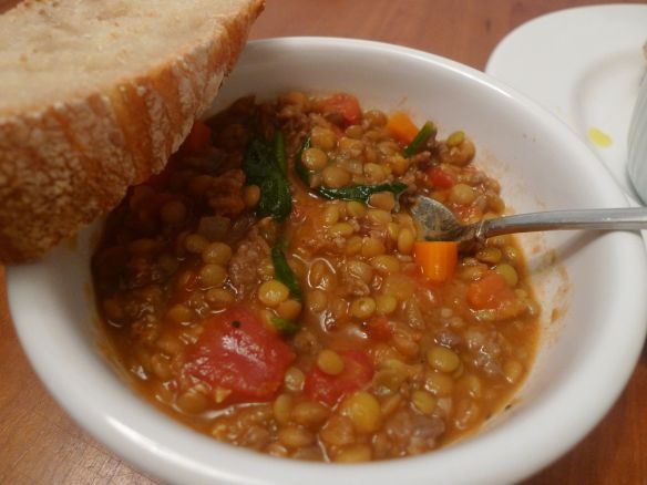 Saute the sausage in a big pot or dutch oven til browned.  Add vegies, garlic, and spices.  Cook til softened, a few minutes.  Add lentils, stock and tomatoes. Bring to a boil and cover – turn to low heat.  Cook til lentils are softened – I’m guessing this was about 45 minutes?  If it gets too thick, you can add some water – I added a tomato can-ful since the lentils weren’t quite soft. When the lentils are soft, throw in as much spinach as you like, and stir a few minutes – it will soften in the heat. Season with salt and pepper as you wish.