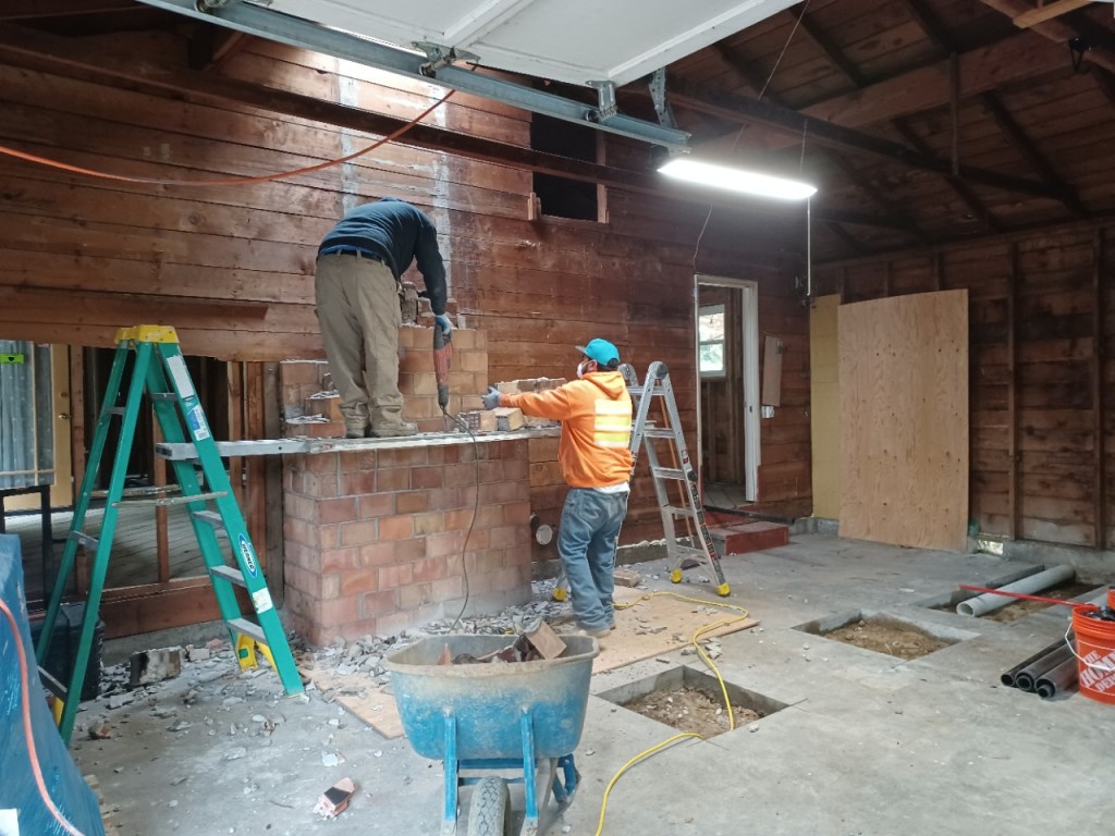 In the meantime, more demolition in the form of tearing out the chimney and framing for the fireplace and kitchen walls!