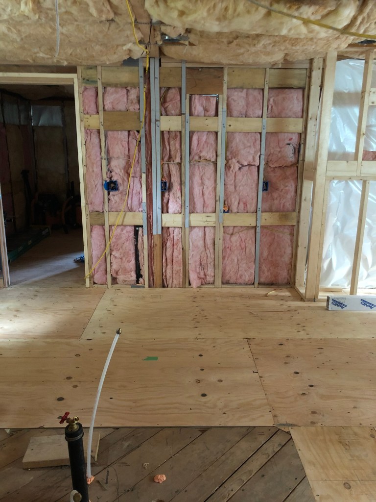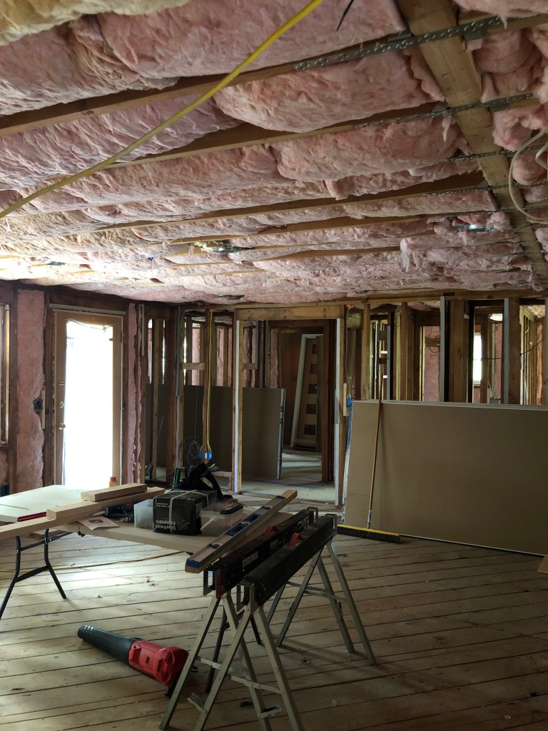 Apologies for missing last week’s update, but the changes, they are happening! Since my last check in with you, we have insulation! For the first time! Previously there was only a very thin layer in the attic, NONE in the walls at all. Check it out! So lovely and plush!