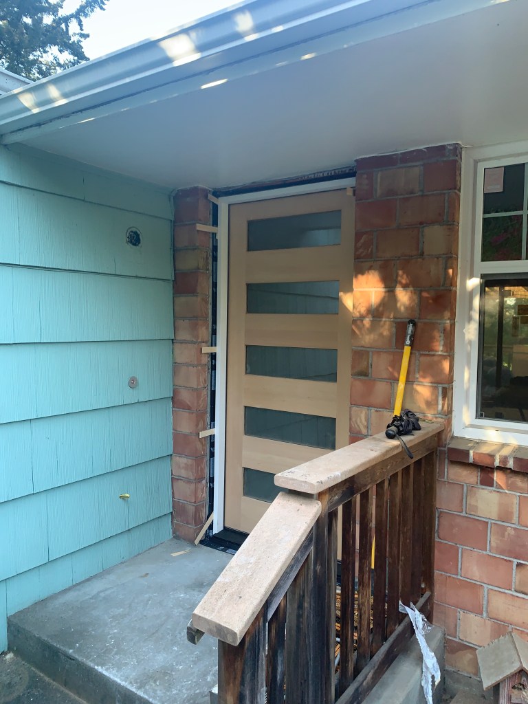 Our new front door was hung. The outside will be painted, but the inside will be left natural.